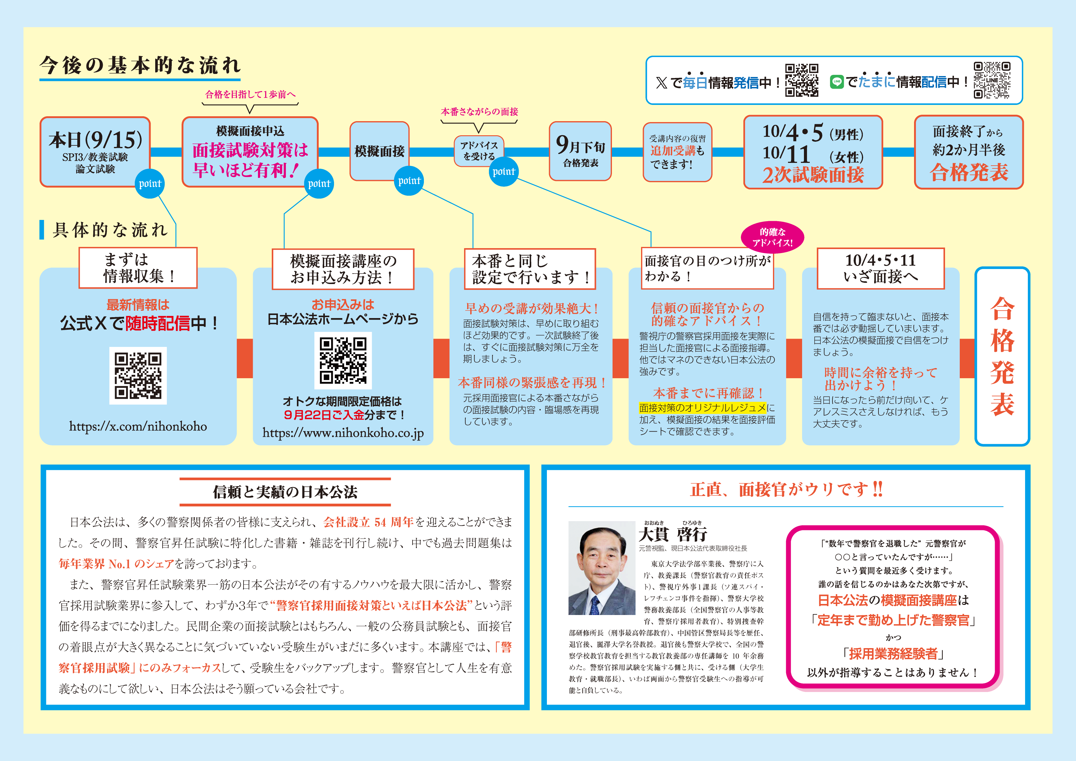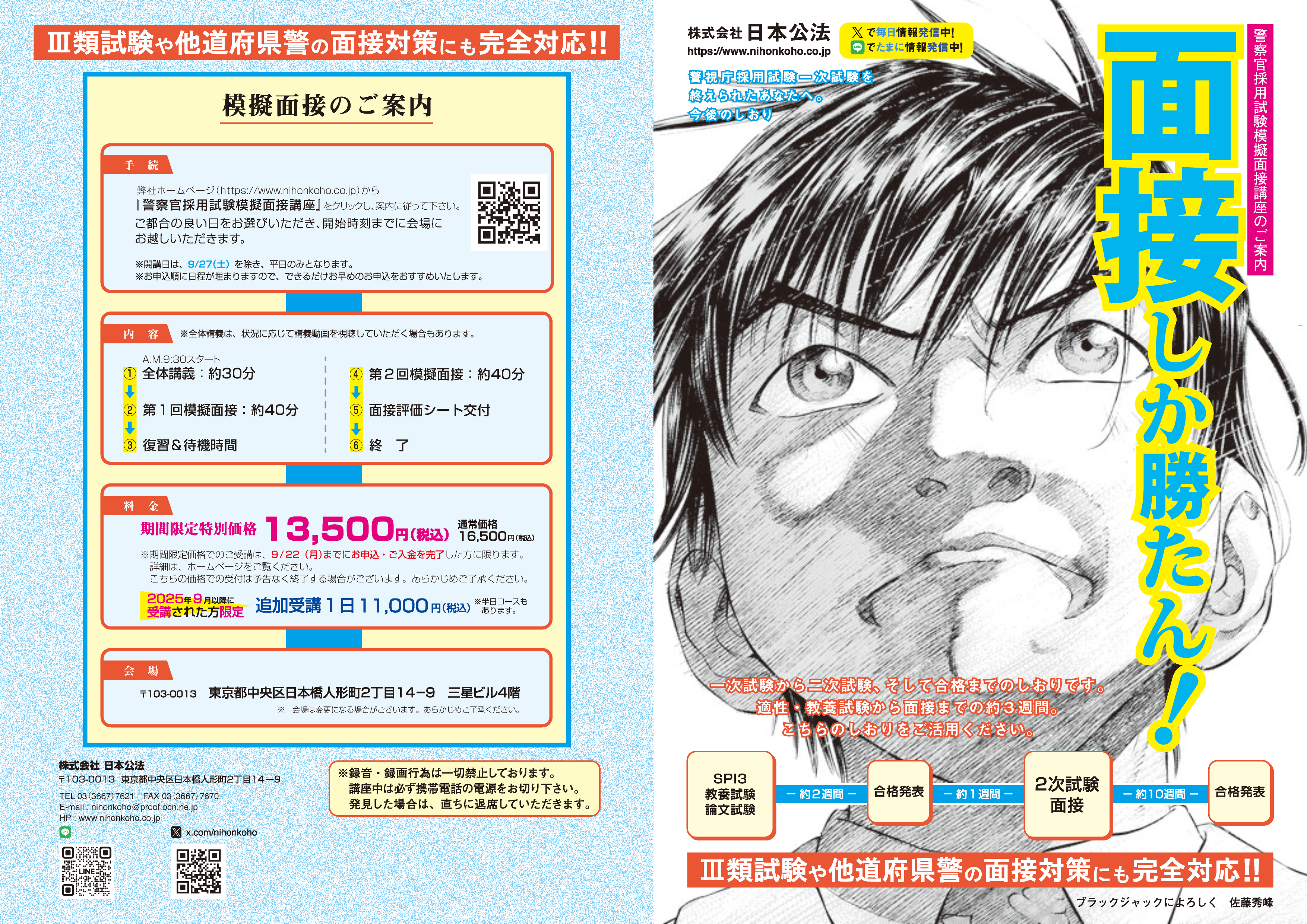 | 備 考 | ※ 「面接カード指導付き」は、受験先の面接カードを提出していただき、それを元に模擬面接講座の講義を受けていただくコースです。 ※ クレジットカード・Amazon Pay決済後、またはお振込確認後のキャンセルによるご返金は一切できませんのでご注意ください。 ※ 「警察官採用試験1類過去問題集」(日本公法発行)をご購入された方は、お問い合わせください。 |