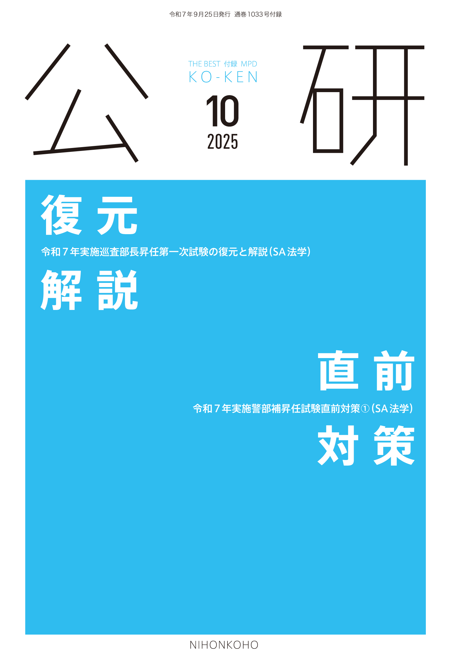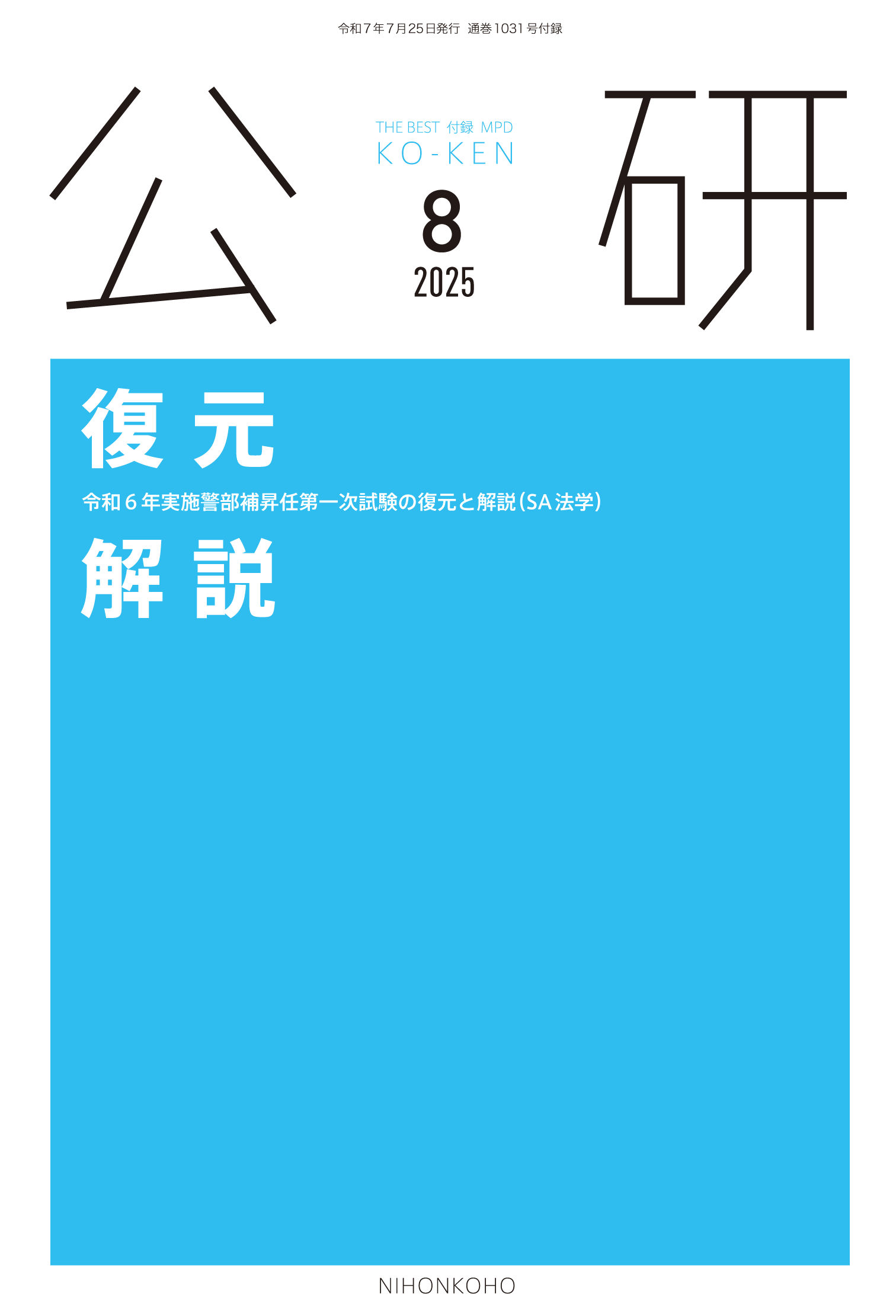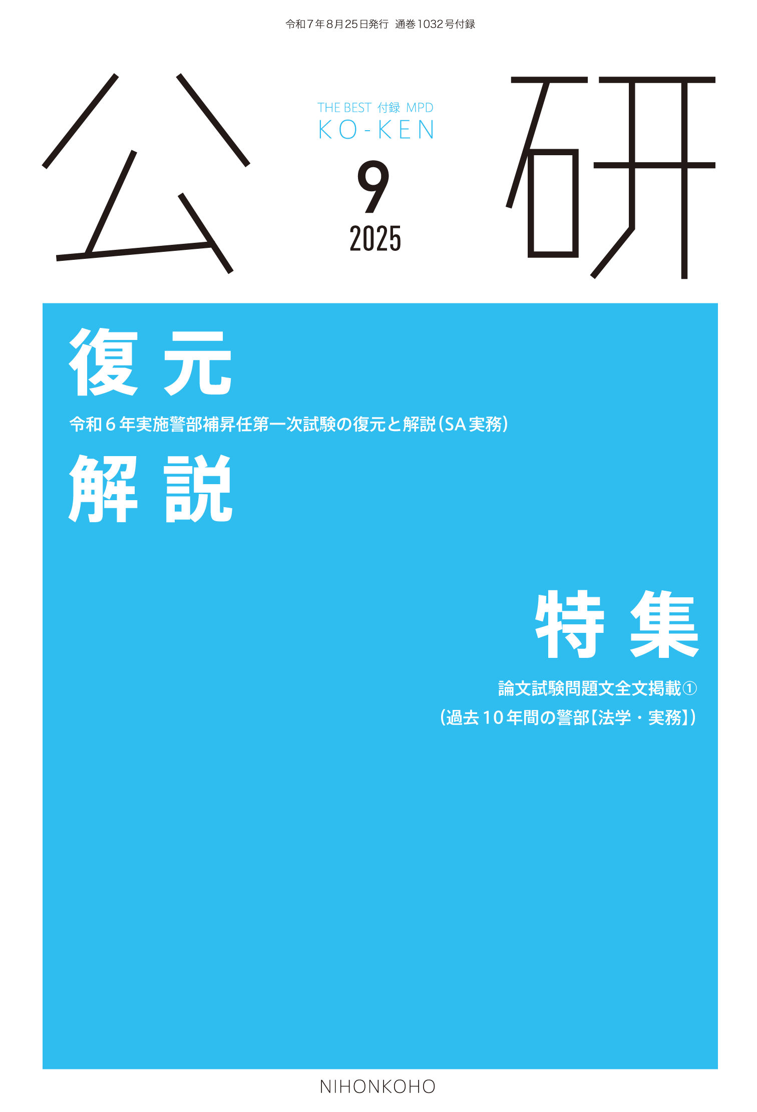 2025年3月号 ![]() | ベスト(完売) 【連載】皆んなの行政法 第5部 その他② 【捜査書類作成要領】現行犯人逮捕及び捜索差押手続書 公 研(完売) 別冊解答 |