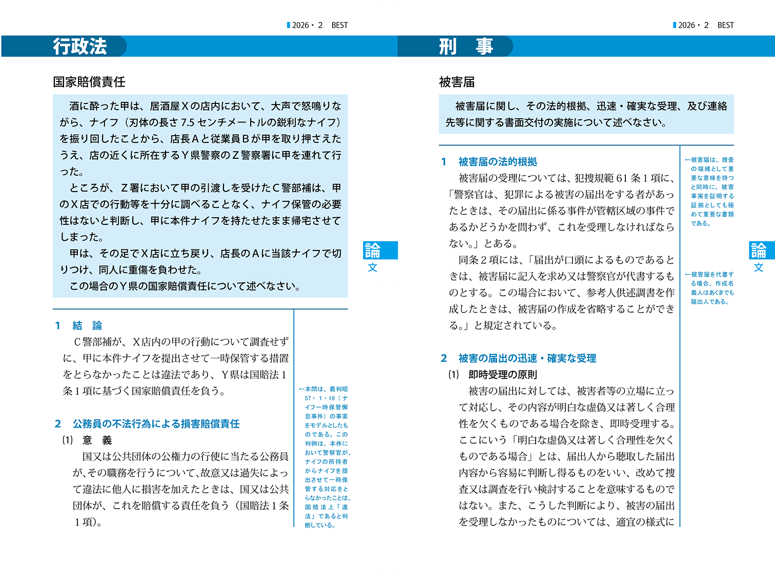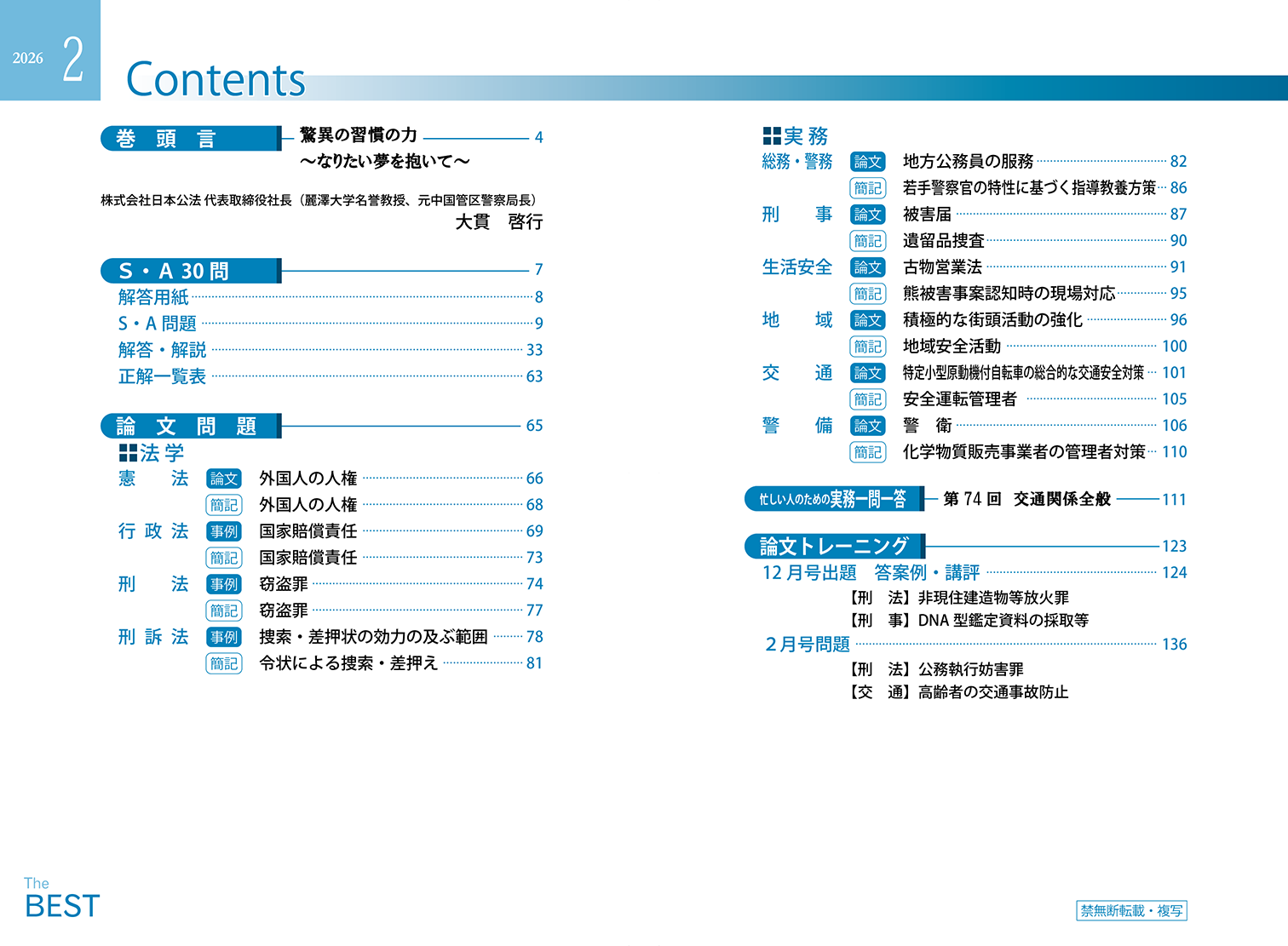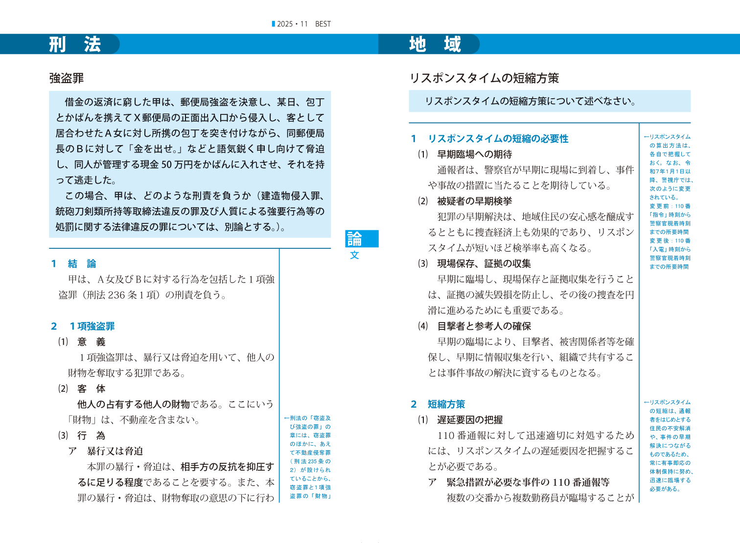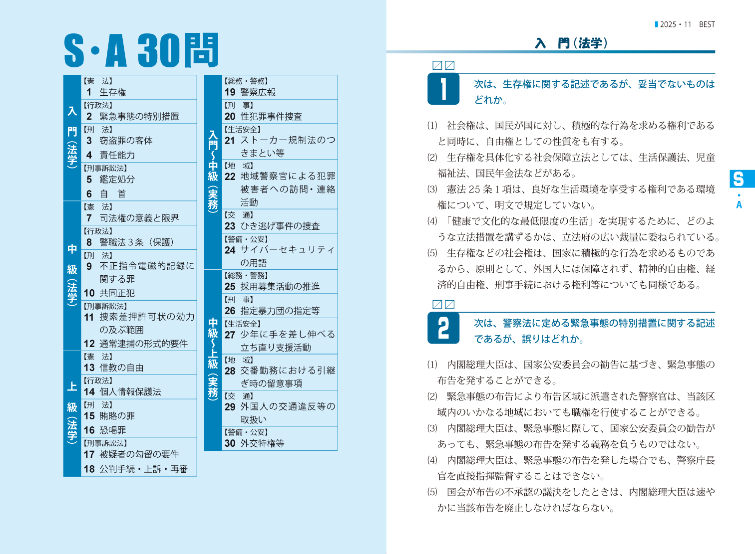 日本公法の看板ともいえる月刊誌ベスト。創刊から50年を超え、どこよりも受験生の立場に近い月刊誌を目指して、中身も大胆に刷新。昇任試験を知り尽くした日本公法だからできる、各都道府県の過去問の徹底分析に基づいた的中率の高い問題。さらに、2次試験突破に必須の論文添削が無料で受けられるのは日本公法だけ!最初から最後まで、昇任試験に関係する情報しか載っていません。日夜仕事に精を出しながらも「何がなんでも昇任試験に受かりたい!」、そんな警察官を月刊誌ベストは強力にサポート致します。