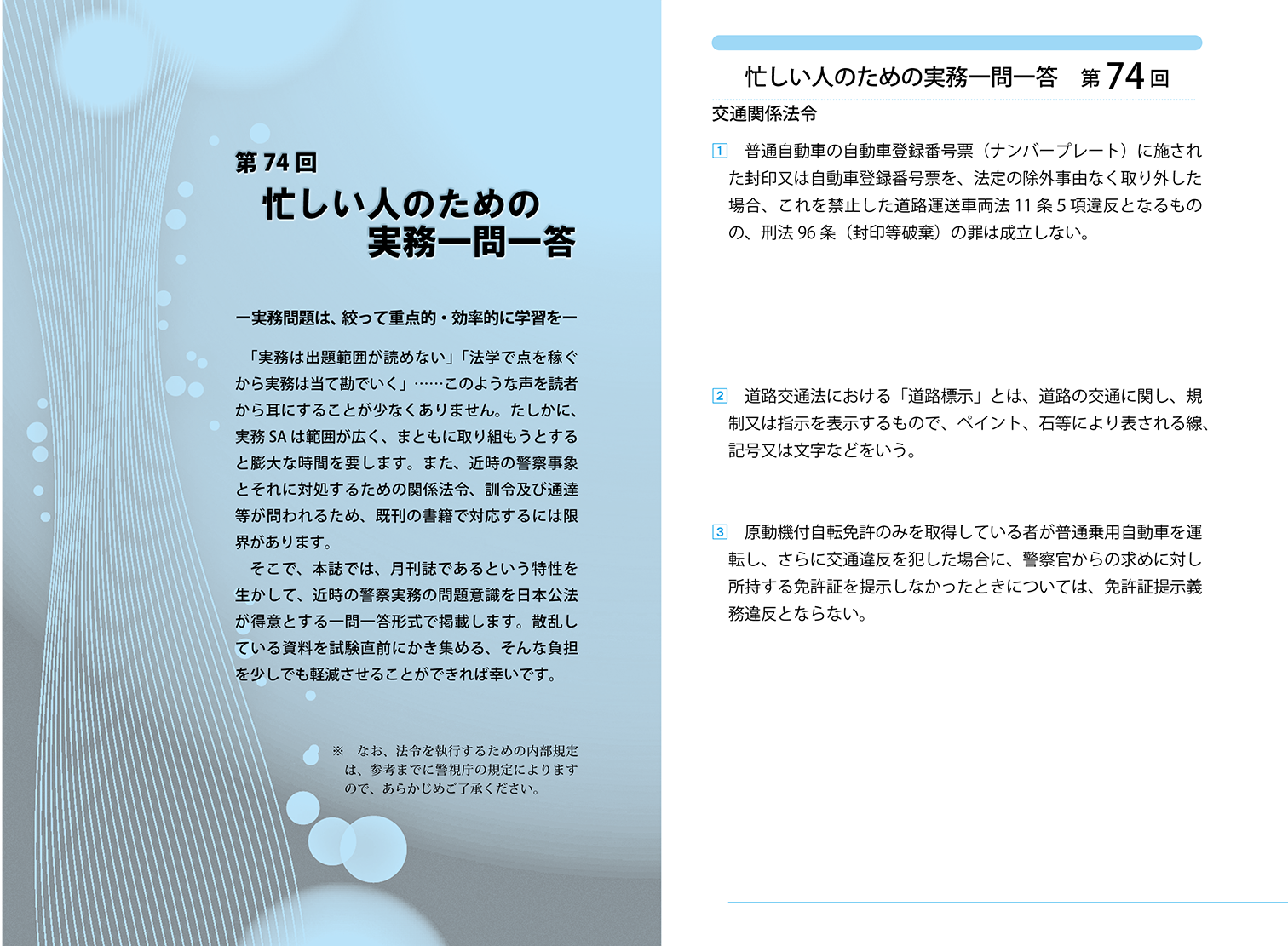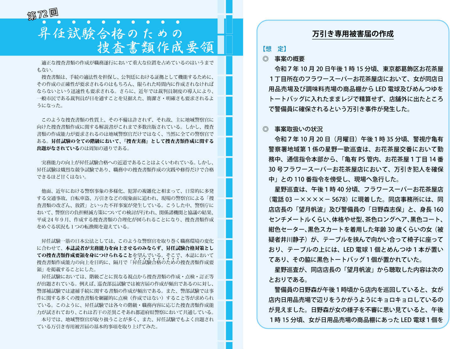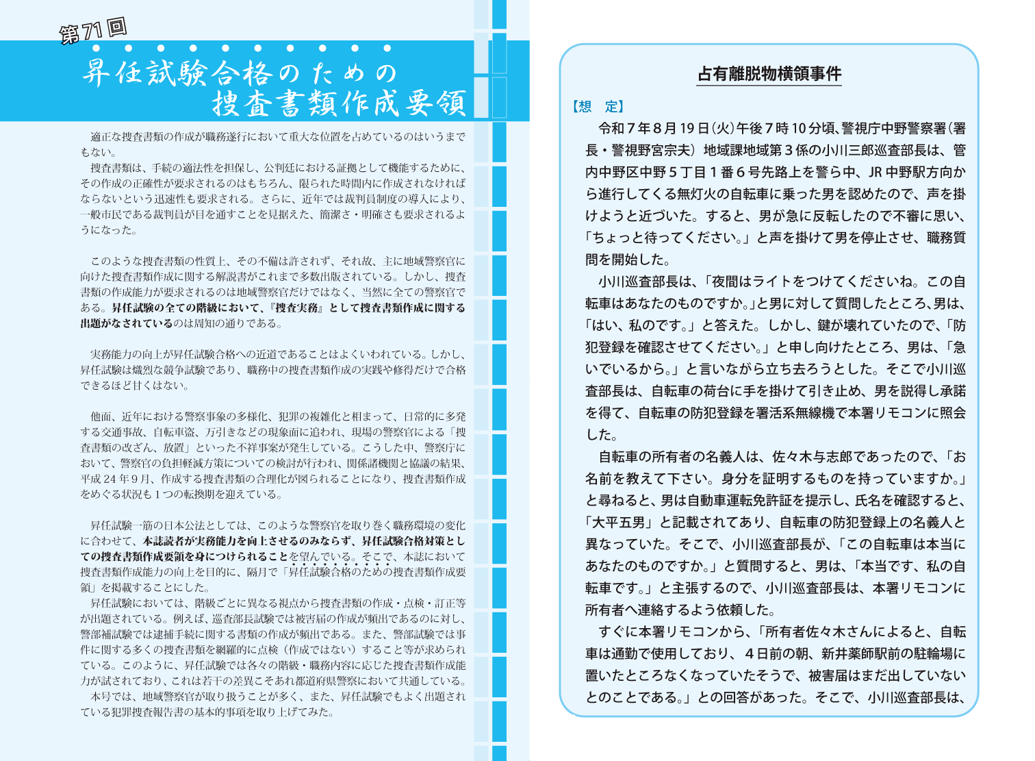 こちらでご注文の場合は、最新号をお送りします。本書は、警察官の方のみへの販売となります。ご購入の際、「お届け情報」入力画面にある「所属名及び所属コード」欄に、ご所属先を必ずご入力ください(例:「警視庁◯◯署 コード123」「大阪府警第◯機動隊」等)。空欄の場合は、発送できません。